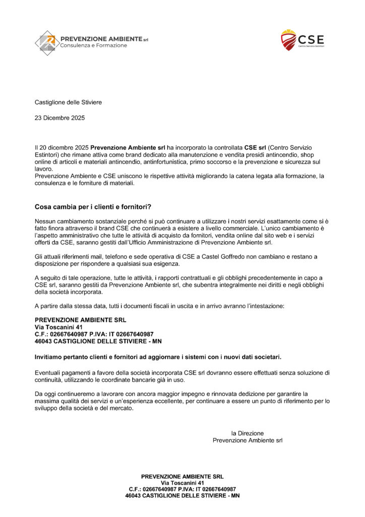 Il 20 dicembre 2025 Prevenzione Ambiente srl ha incorporato la controllata CSE srl (Centro Servizio Estintori) che rimane attiva come brand dedicato alla manutenzione e vendita presidi antincendio, shop online di articoli e materiali antincendio, antinfortunistica, primo soccorso e la prevenzione e sicurezza sul lavoro.